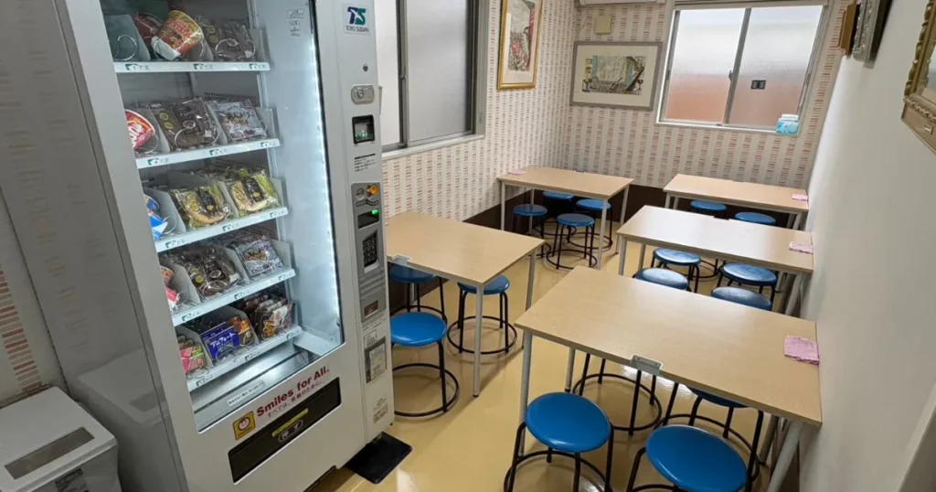 さらに、塾内にはカップラーメンやパン、お菓子などを備えた軽食自販機完備の「ラウンジ」が設けられています。長時間の自習や、学校帰りの受講の合間に、しっかりと食事やリフレッシュをとることができ、生徒たちの憩いの場にもなっています。